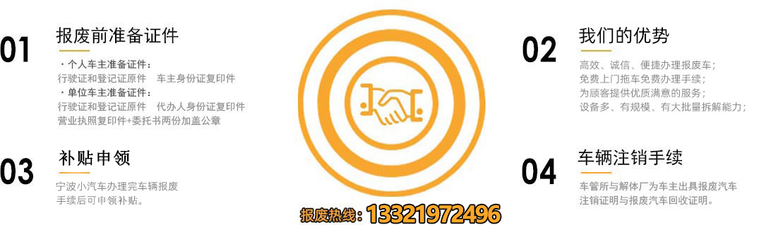 宁波报废汽车拆解公司是宁波市交管局指定的车辆报废回收中心。主要经营:宁波报废车回收、宁波回收黄标车、宁波货车回收、宁波回收货车、宁波报废机动车回收、宁波老旧车回收、宁波高价收购二手车、宁波异地报废。
